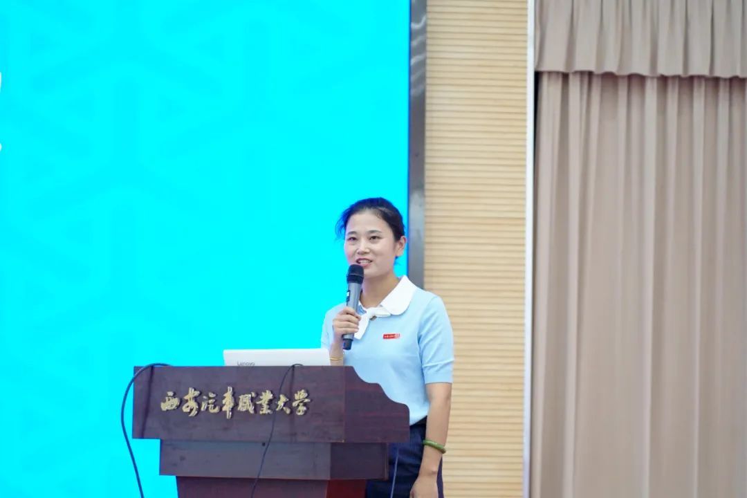 经济管理学院院长李茜代表老教师发言。 她希望新教师关爱学生,爱岗敬业,刻苦钻研,严谨笃学,以身作则,为人师表,真正做到“学高为师,身正为范”。 她说: “学然后知不足,教然后知困,今后我们的教师生涯中,一定充满困惑迷茫、不知所措,但我们要相信,微微风舞浪,散后满天星,我们在讲台上散发的点点‘灯光’,定将汇聚成西汽的星辰大海。 ”