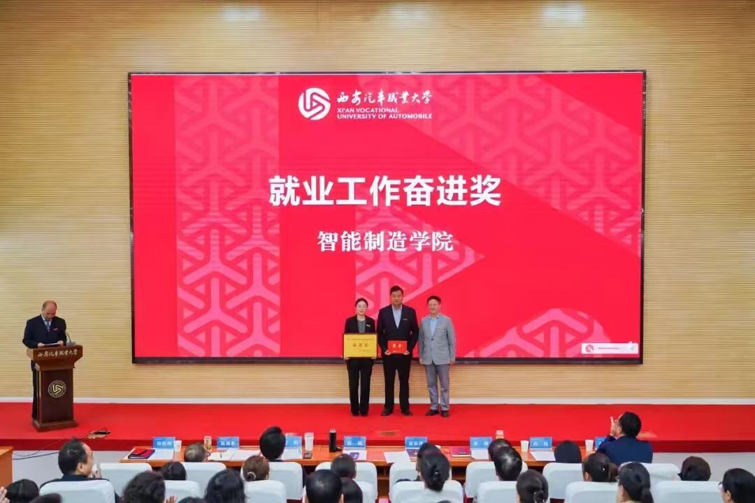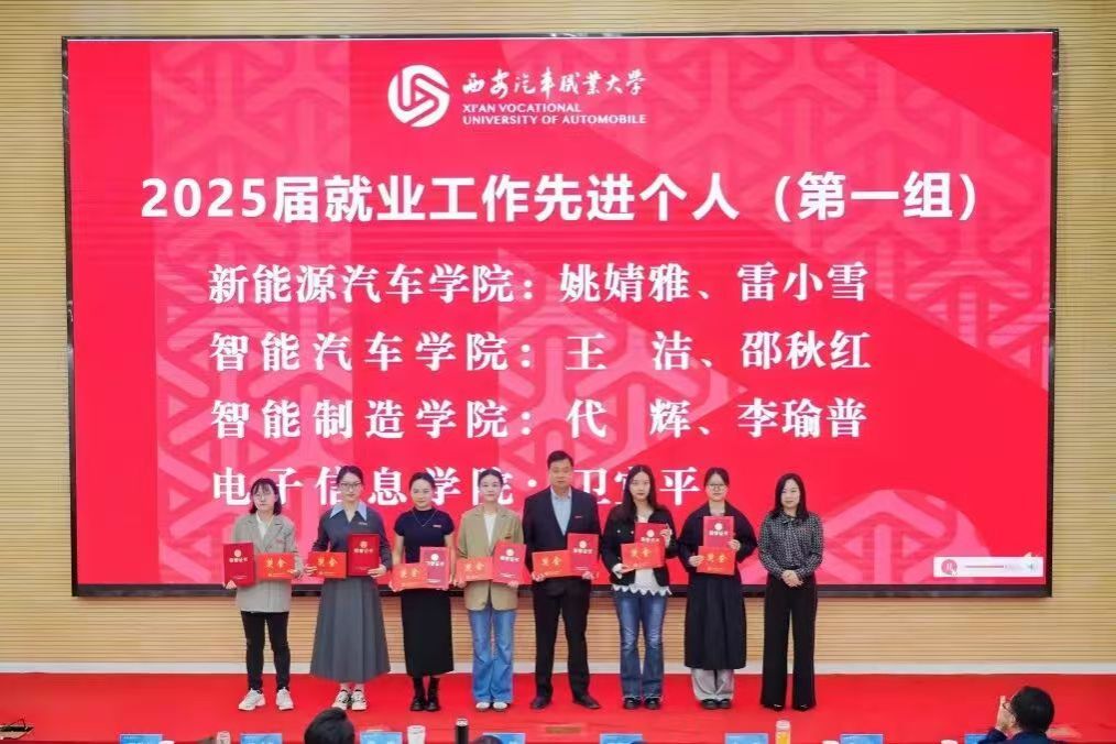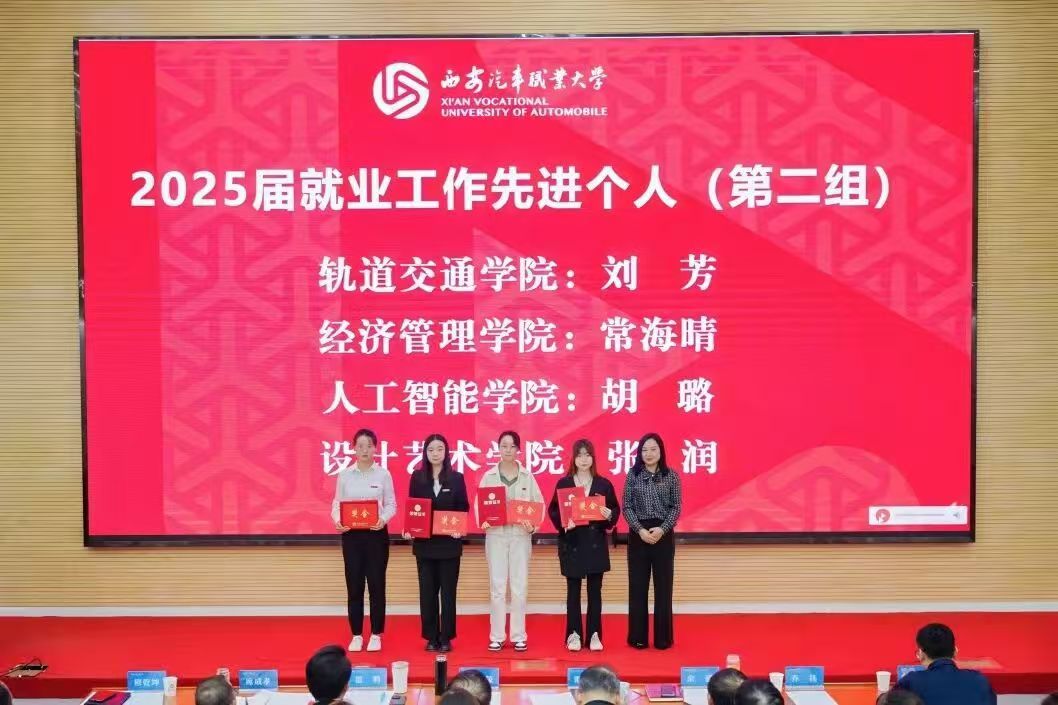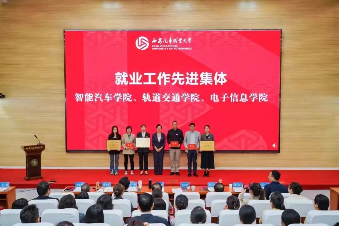会议还对2025届就业工作中表现突出的先进集体与个人进行表彰。其中智能汽车学院、轨道交通学院等单位获评“就业工作先进集体”,智能制造学院获评“就业工作奋进奖”,姚婧雅、雷小雪等10余名教职工荣获“就业工作先进个人”荣誉称号。校领导为获奖代表颁奖,以此树立标杆、传递激励,号召全体教职工以先进典型为榜样,主动担当作为,凝聚起推动学校就业工作再上新台阶的奋进力量。