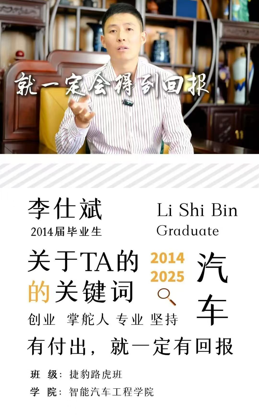 回溯选择汽车专业的初心,是他对行业未来高速发展的精准判断;提及母校的价值,是学校的专业性与来自全国各地的同学资源,为他的创业之路与长远目标埋下了伏笔。如今,他将“事在人为”与“付出必有回报”作为人生座右铭,既是对自己过往经历的总结,更饱含着对后辈的期许。