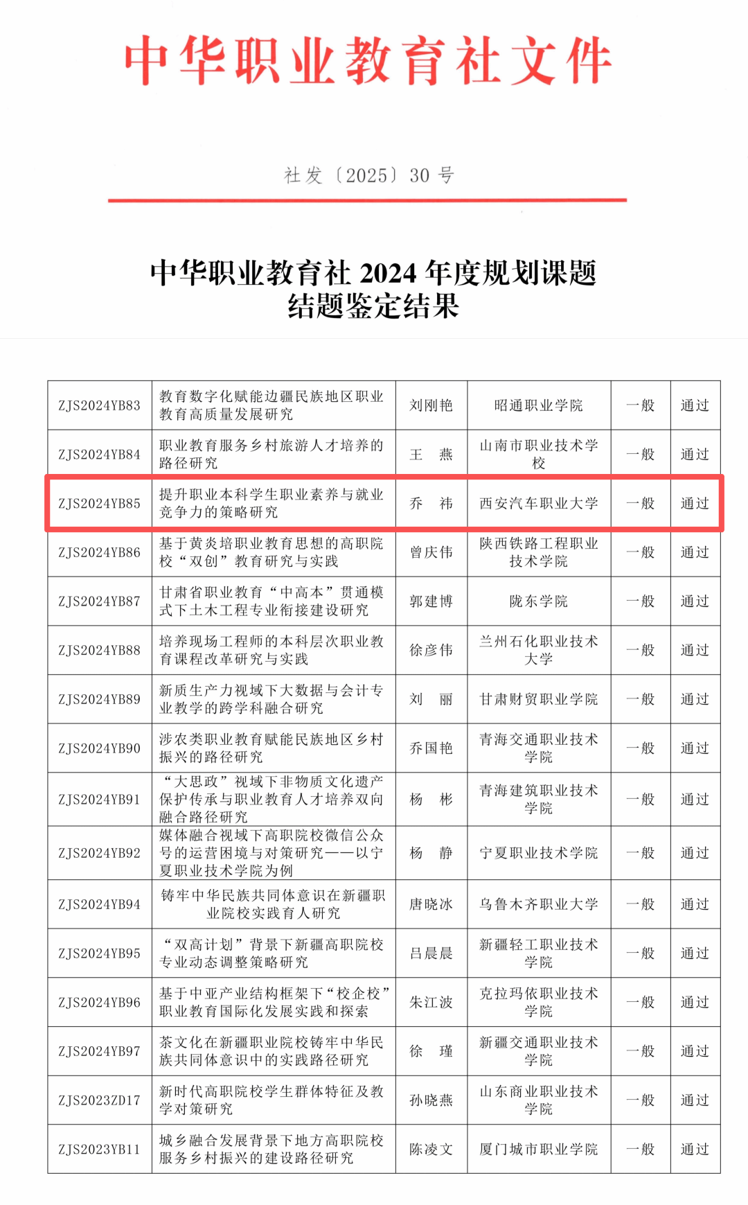 中华职业教育社的年度规划课题是推动职业教育理论研究与实践创新的核心抓手,在全国职业教育界具有较高权威性和影响力。课题紧密围绕国家重大战略和职业教育改革发展的主要任务,体现了鲜明的时代性和导向性。本次结题全国共150项,陕西省按期结题5项,100%完成研究任务。我校承担其中一项课题,充分彰显学校在职业教育研究领域的深厚积淀与创新实力。
