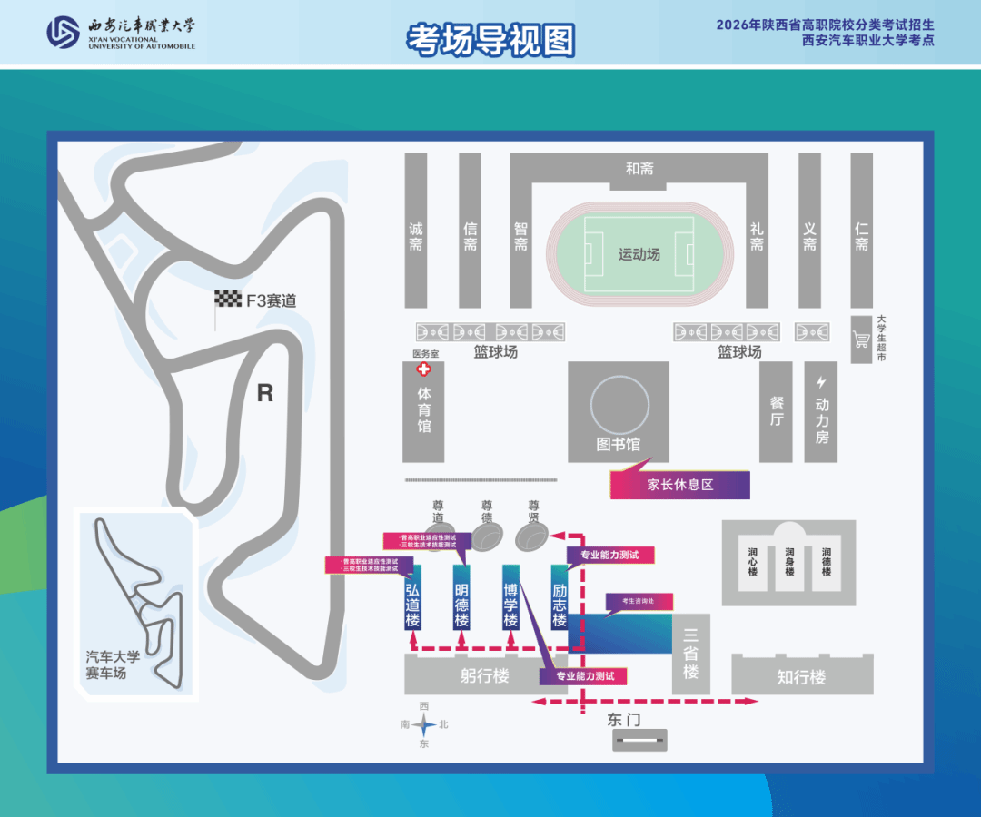 1.考生入校后,由现场志愿者引导至对应考场或候考区等候,外来车辆一律停放至指定区域;