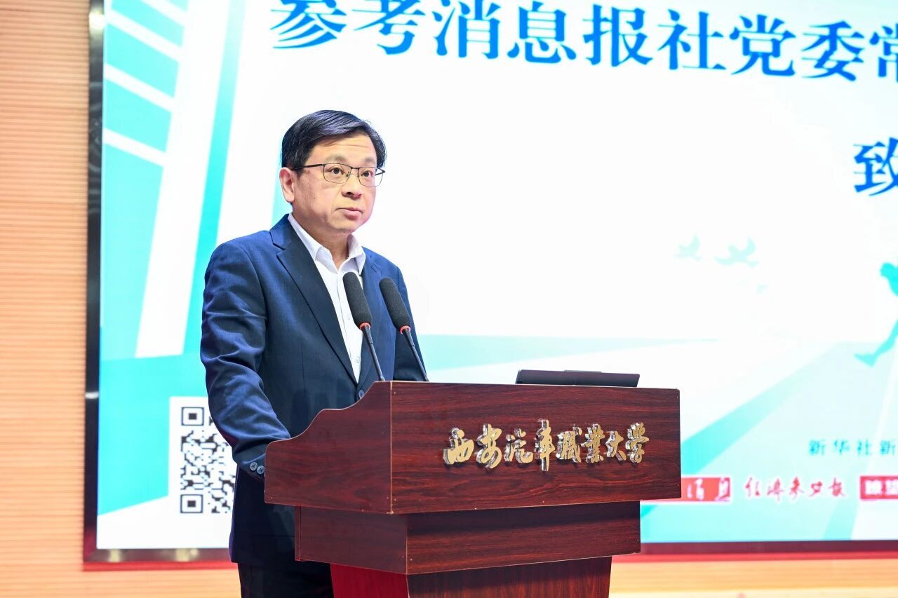 乔祎代表学校致欢迎辞,她指出,“新声无限——新华社进校园”活动已连续四年走进我校,成为校园内极具影响力、备受师生期待的文化盛事。她代表学校党委及全体师生,向新华社、参考消息报社各位领导、嘉宾的莅临指导,致以热烈欢迎和衷心感谢。她表示,新华社作为国家通讯社,是记录时代、传播真理、凝聚共识的重要阵地,《参考消息》是中国人洞察世界、世界了解中国的重要窗口。本次活动为我校“大思政课”建设注入活力,为学子成长开辟路径。作为全国首批汽车类本科层次职业大学,学校将坚守“为党育人、为国育才”使命,深耕产教融合,培养契合产业升级的高端技能人才。同时,她希望师生珍惜此次机会,拓宽视野、坚定信念、强化担当,并期待深化校媒合作,携手为青年学子成长赋能。