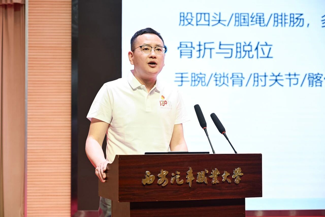 西安交大二附院专家团队系统讲解了校园常见突发急症识别与处置原则,重点强调“黄金4分钟”心肺复苏(CPR)的核心要点,细致演示AED自动体外除颤仪的规范使用方法,生动传授气道异物梗阻(海姆立克)急救技巧及创伤止血、包扎、固定基础技能。运动医学科主治医师毛根稳聚焦校园高频场景,针对性讲解了校园运动损伤的应急处理方法,破解师生日常运动中的安全困惑,让在场师生全方位填补急救知识空白。