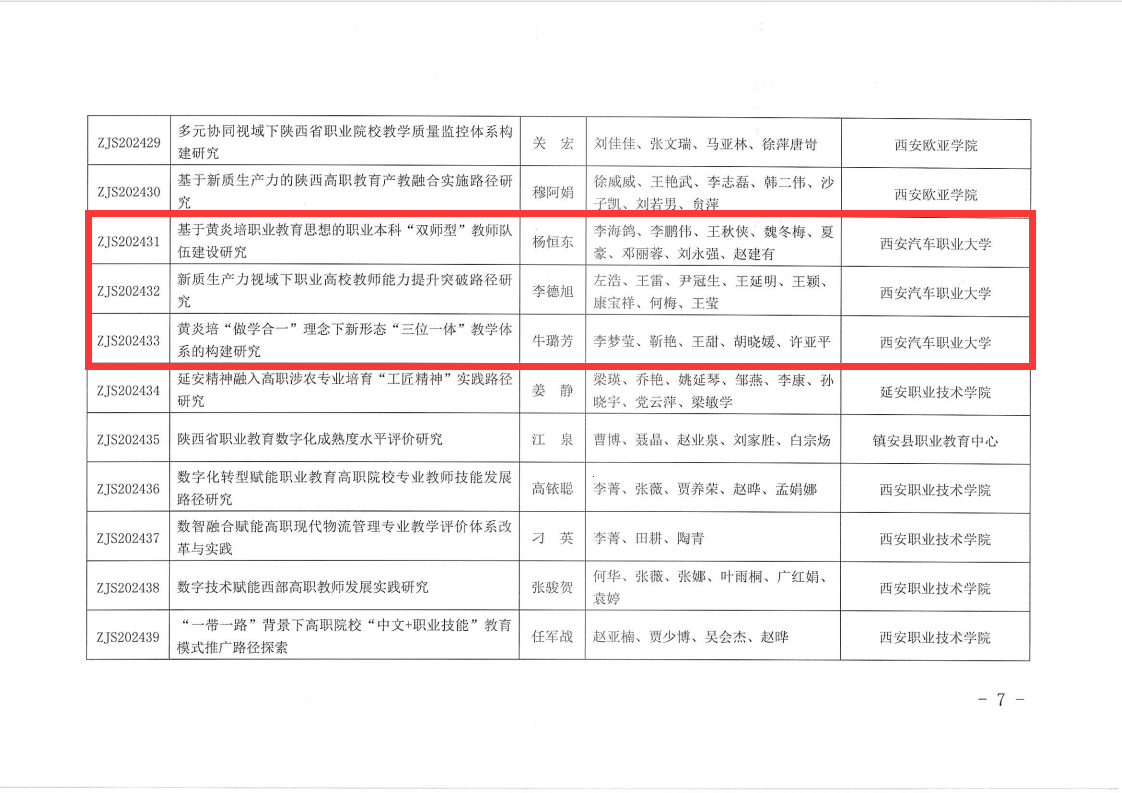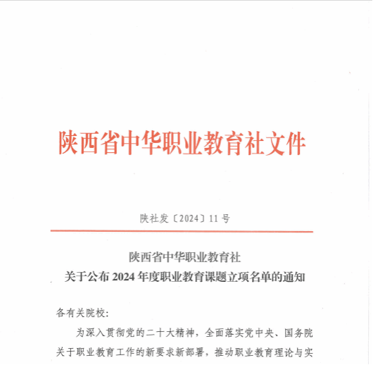 近日,陕西省中华职业教育社公布了2024年度职业教育课题立项名单,我校新能源汽车学院杨恒东、交通工程学院李德旭、文理学院牛璐芳三位老师的课题获批立项。