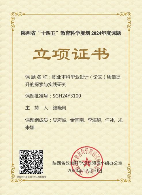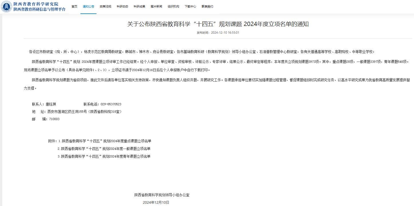 12月10日,陕西省教育科学规划领导小组办公室发布了《关于公布陕西省教育科学“十四五”规划课题2024年度立项的通知》,我校科研处遴选推荐申报的1项课题立项一般课题。