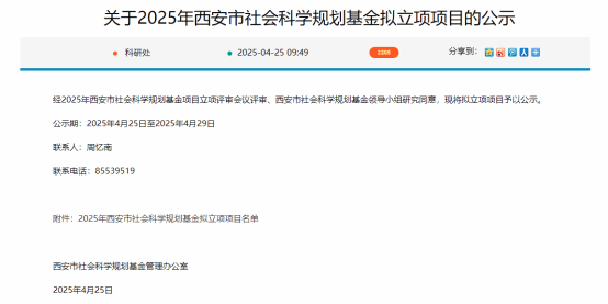 近日,据西安社科网西安市社会科学院 西安市社会科学界联合会官网“社科管理”栏目公布信息,我校王玲老师主持申报的2025年西安市社会科学规划基金项目“基于产教融合的人才培养模式研究”(项目编号:25JY119)获批立项。