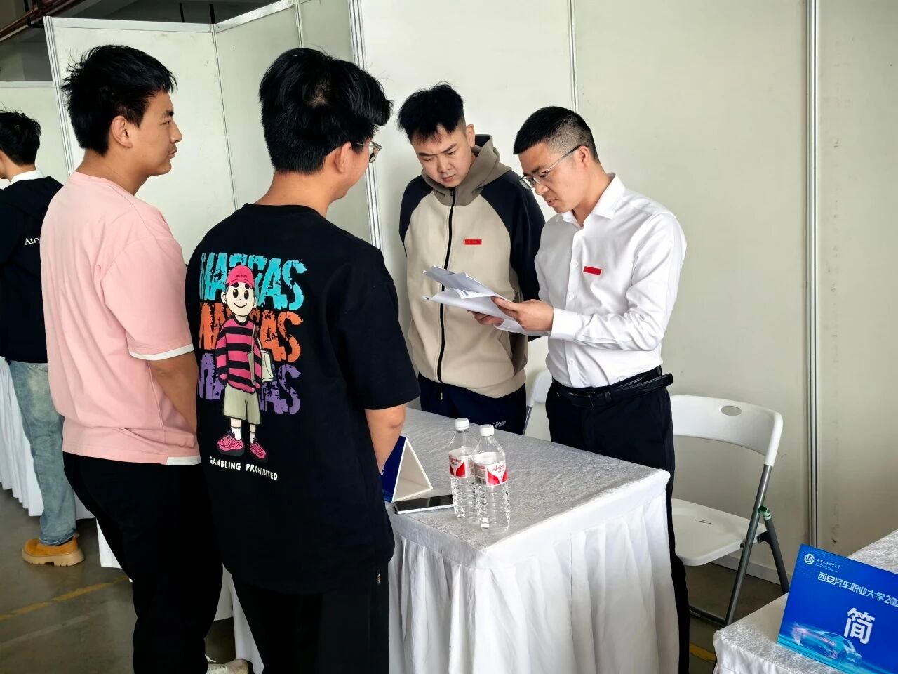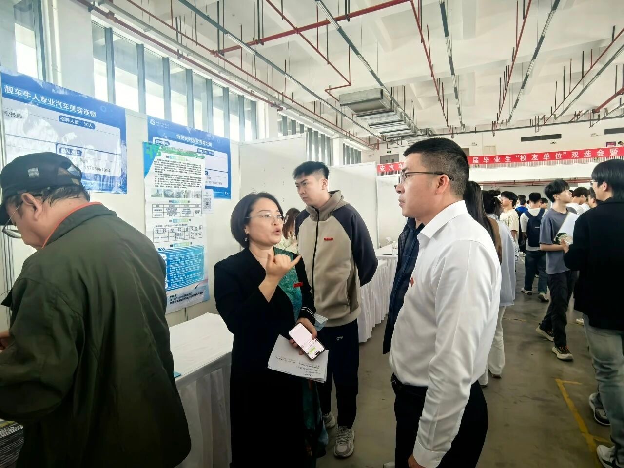 作为毕业班辅导员,池易松,高瑞悦老师现场与求职学生亲切交流,询问求职进展并给予针对性指导。他鼓励学生把握双选会机遇,积极展示自身优势,同时提醒毕业生树立正确就业观,结合个人职业规划理性选择岗位。