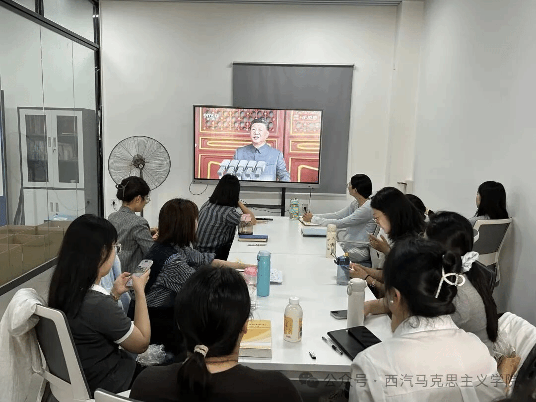 9月3日上午,马克思主义学院组织全体教师集中观看了“纪念中国人民抗日战争暨世界反法西斯战争胜利80周年大会”实况直播,学习领会习近平总书记重要讲话。老师们纷纷表示,此次阅兵不仅是一场展示国威军威的盛况,更是一堂生动深刻的爱国主义教育课,作为思政课教师,要将这种自豪感和使命感传递给学生,引导学生坚定“四个自信”,厚植家国情怀。