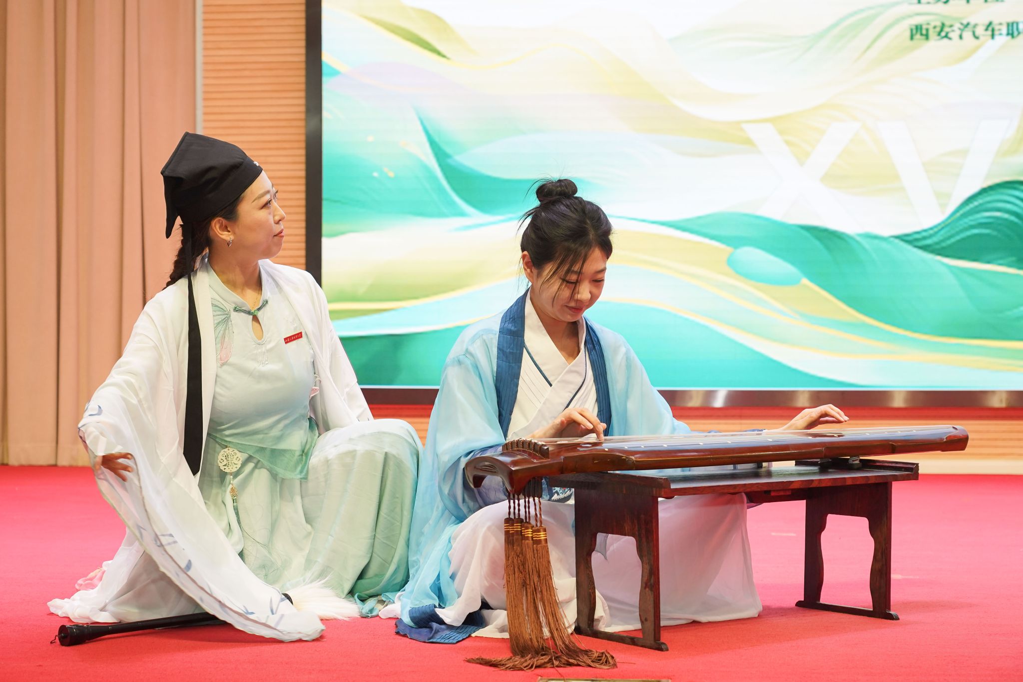 进入古文诵读环节,舞台呈现令人耳目一新。舞台左侧,王羲之、谢安两位古人的扮演者端坐于“流觞曲水”之畔,大毛笔、书法卷轴、古琴、古书籍错落陈列,魏晋风度扑面而来。尤为引人注目的是,现场展示的书法作品题写“惠风和畅”四字,与《兰亭集序》中“天朗气清,惠风和畅”的文句遥相呼应,文墨相生,意蕴悠长。伴随着脱稿诵读,两位古人以舞蹈语言应和文本情绪,一觞一咏之间,从“仰观宇宙之大”的畅快到“死生亦大矣”的深沉慨叹,层层递进,扣人心弦。当诵读“群贤毕至”“信可乐也”时,声震全场,气势恢宏。